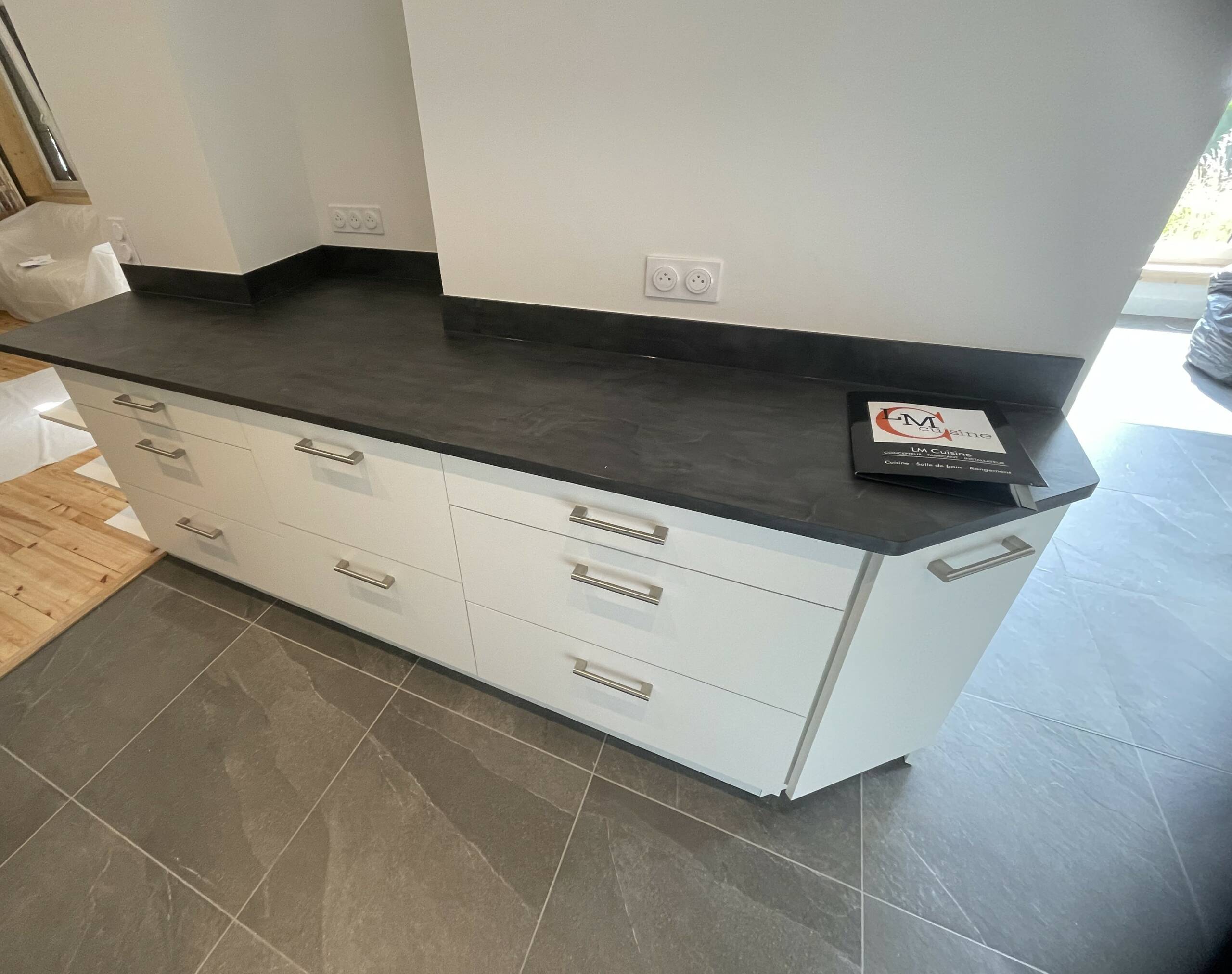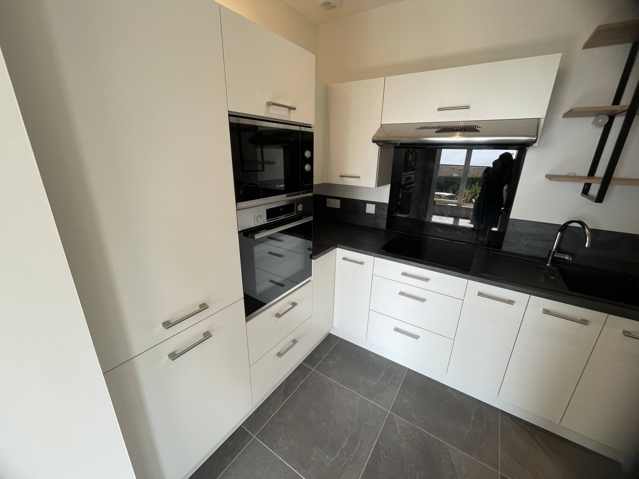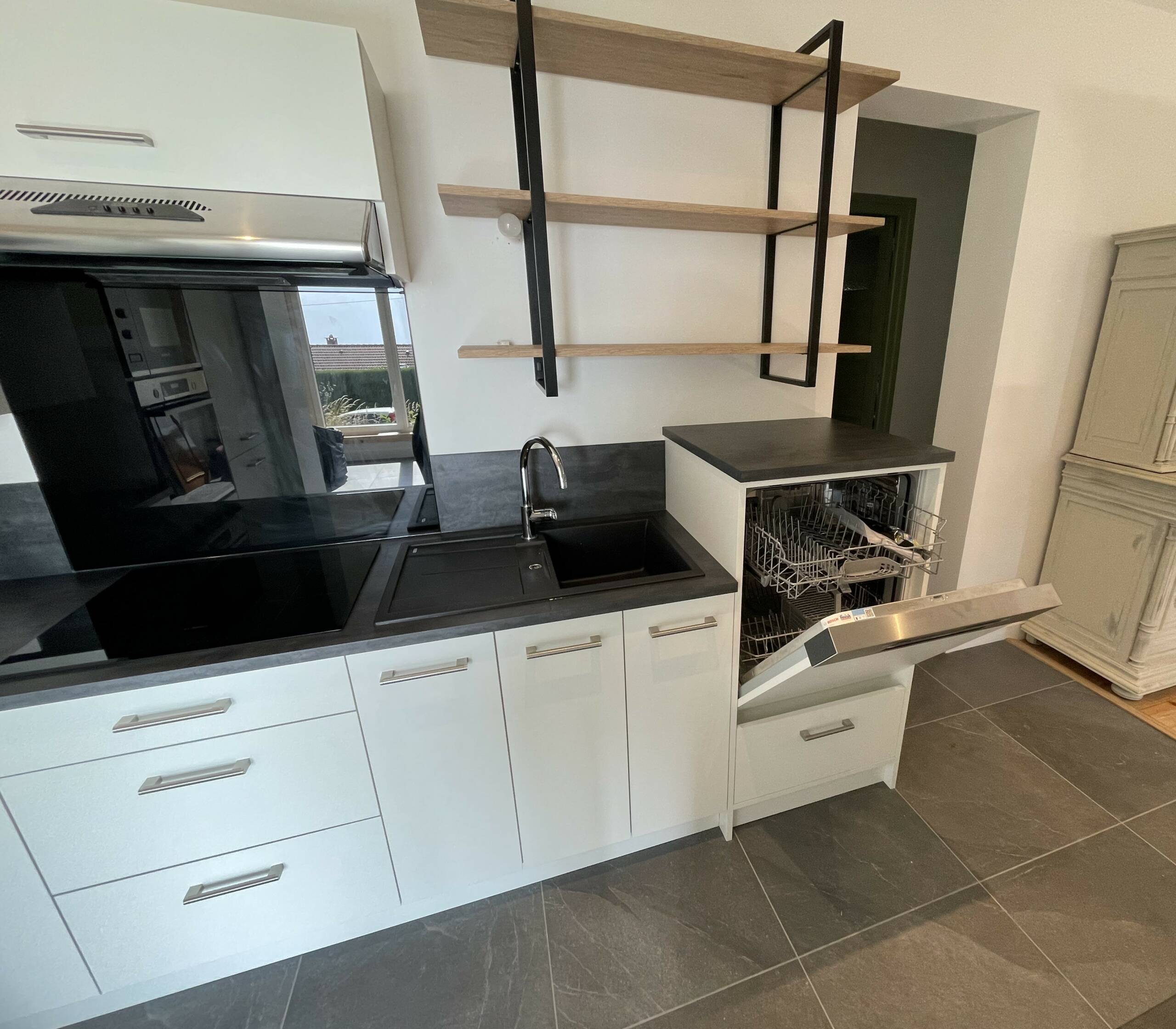 Cuisine équipée avec lave-vaisselle à hauteur, étagère décorative et tourniquer d’angle…