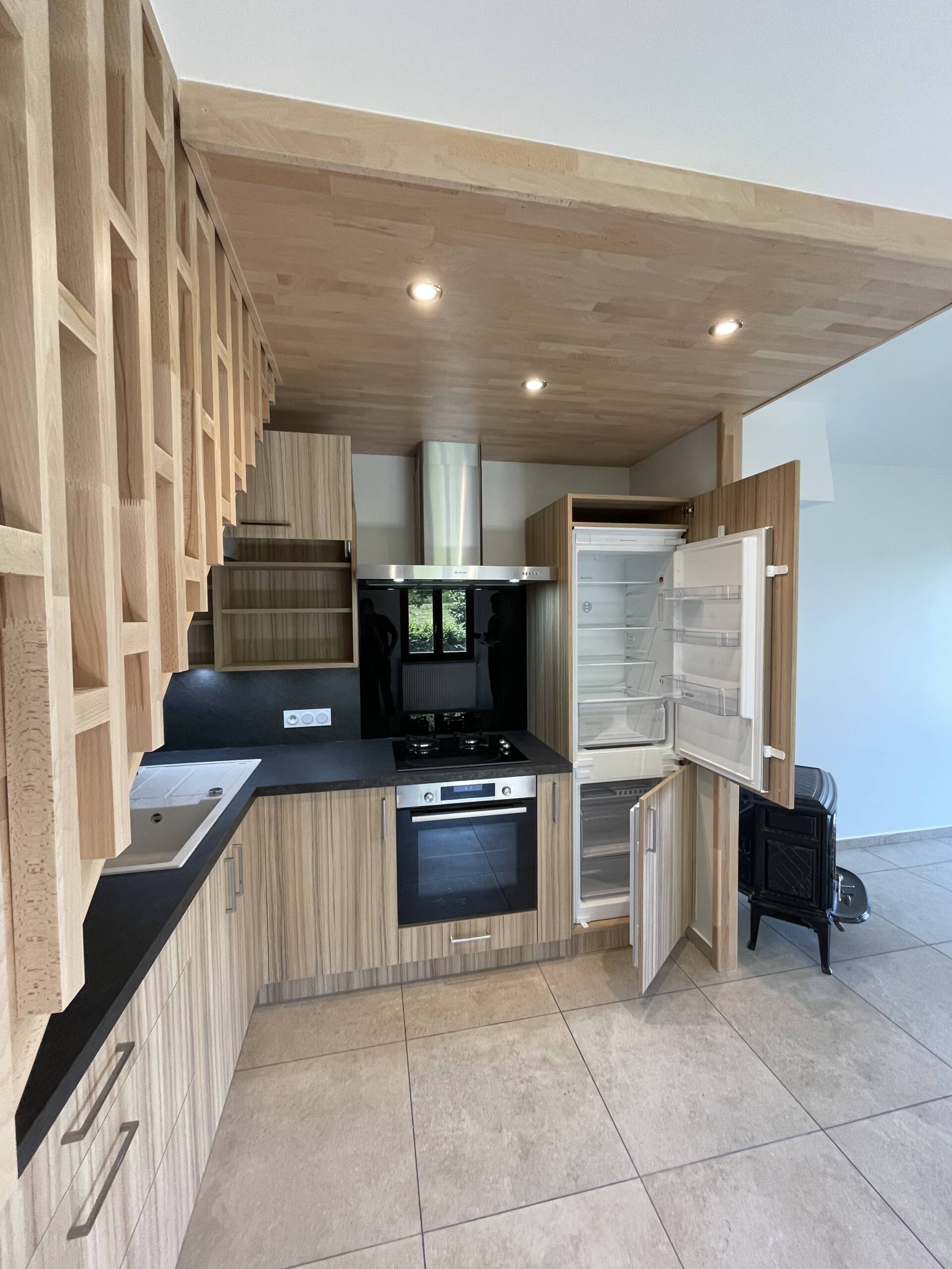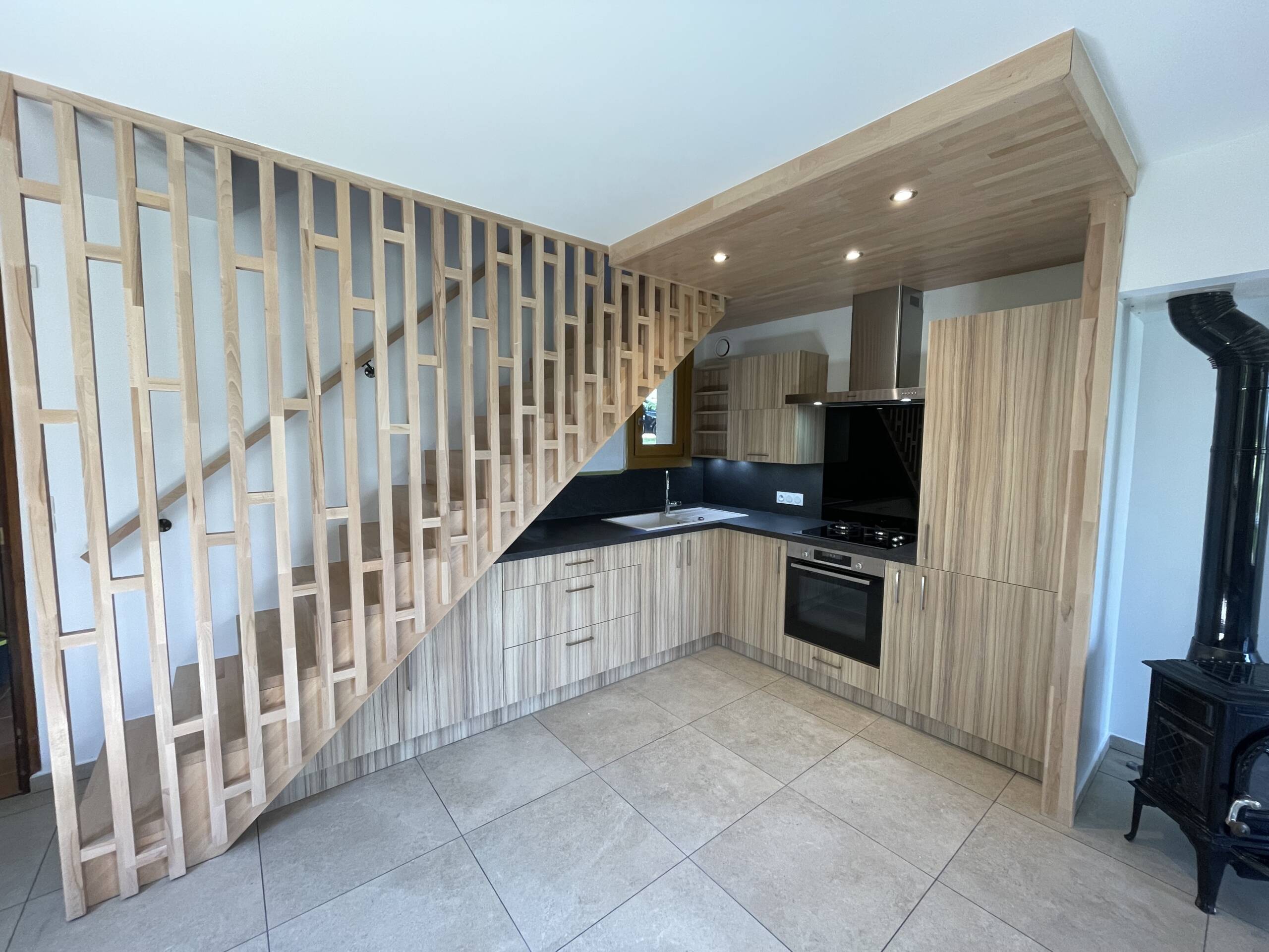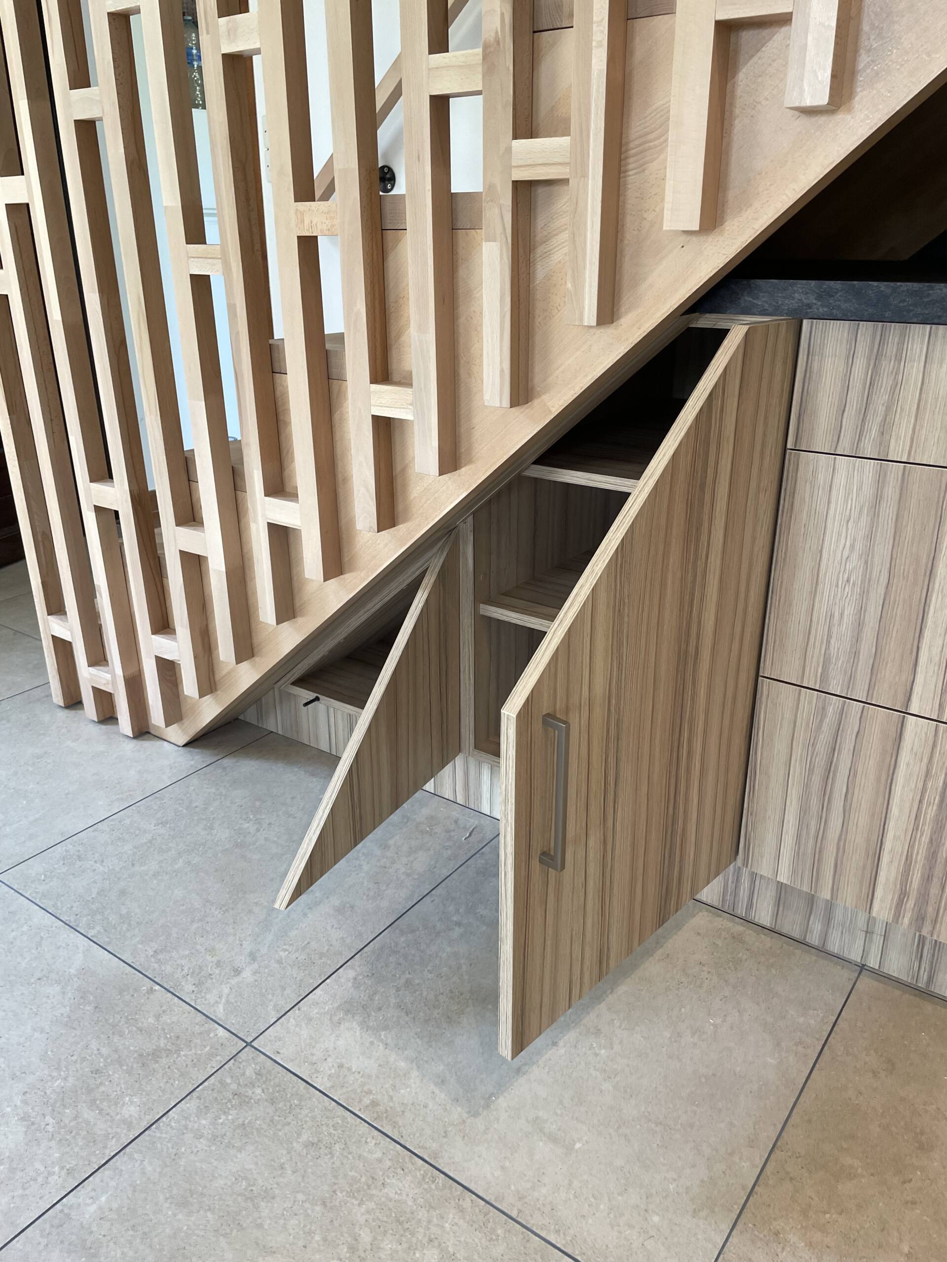 Cuisine d’angle avec réfrigérateur encastré, meuble sur mesure sous escalier et soffite avec spot et claustra en hêtre…