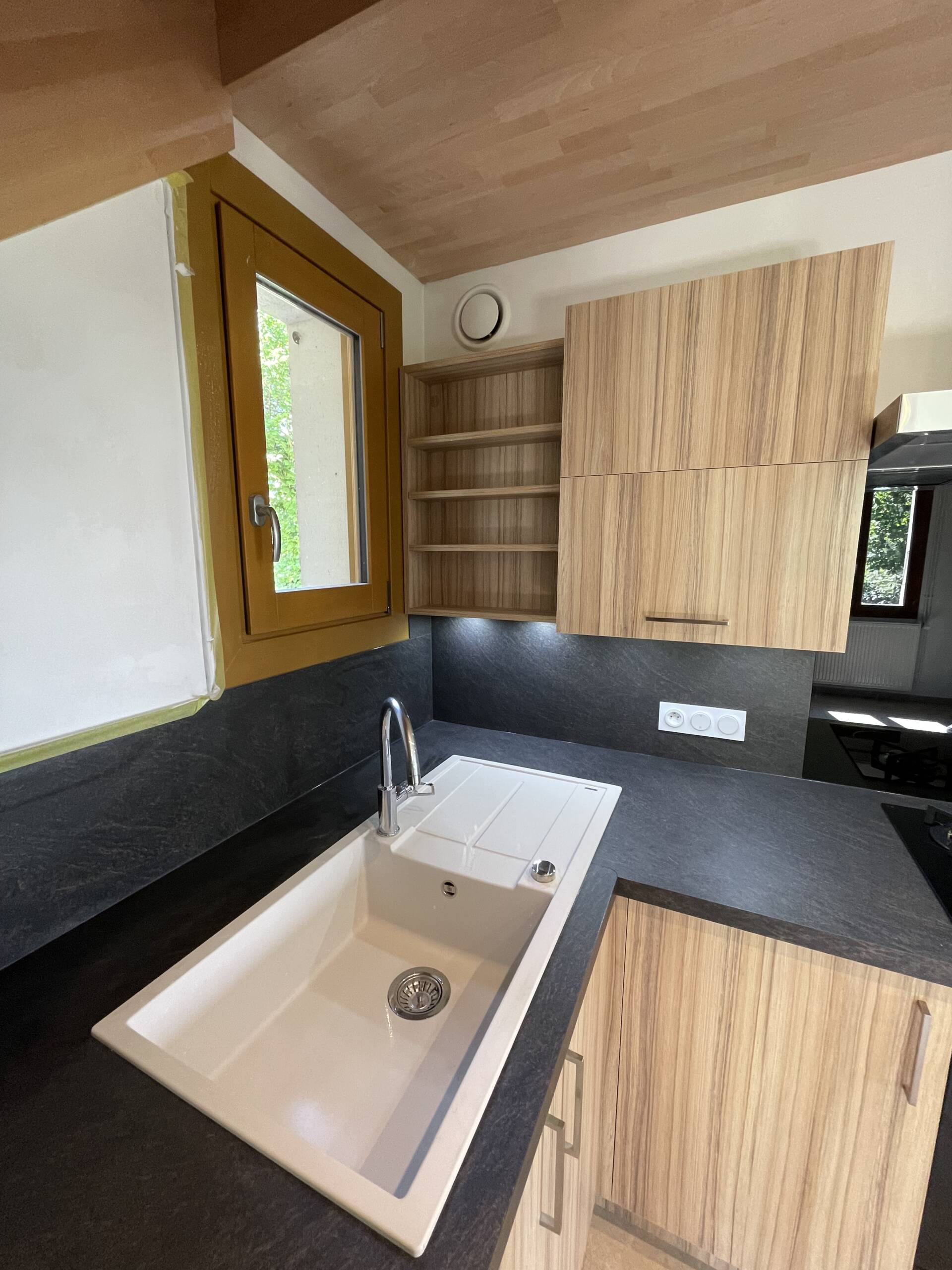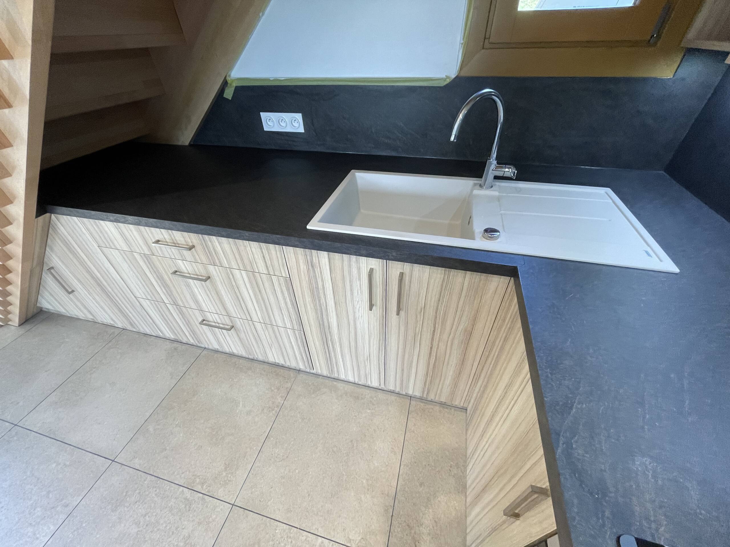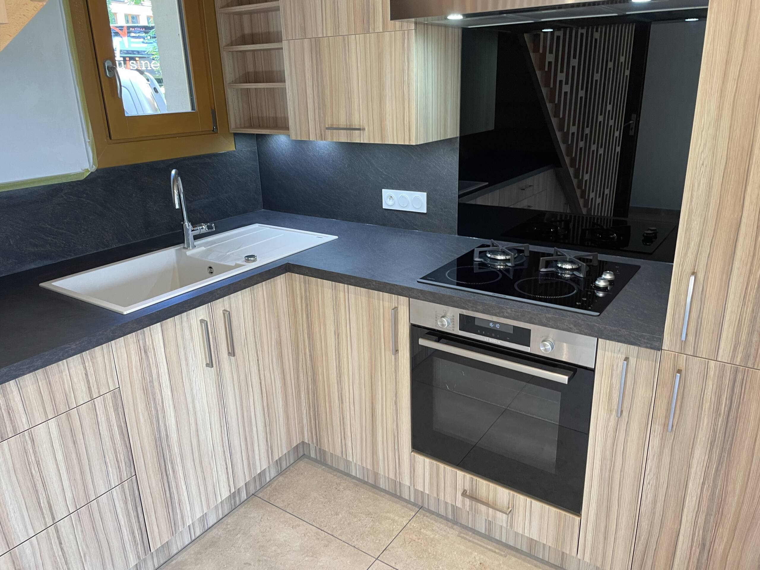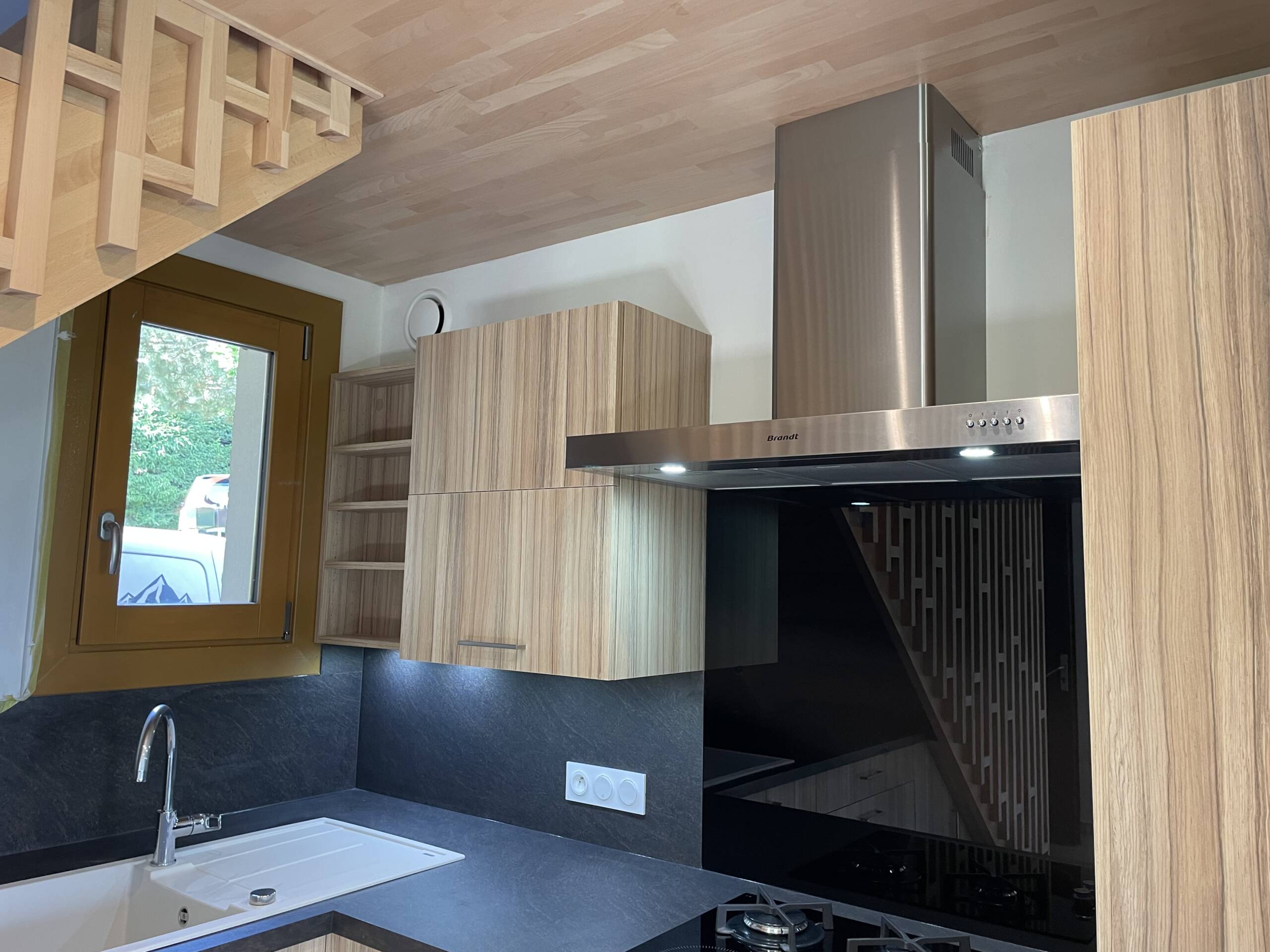 Cuisine d’angle avec réfrigérateur encastré, meuble sur mesure sous escalier et soffite avec spot et claustra en hêtre…