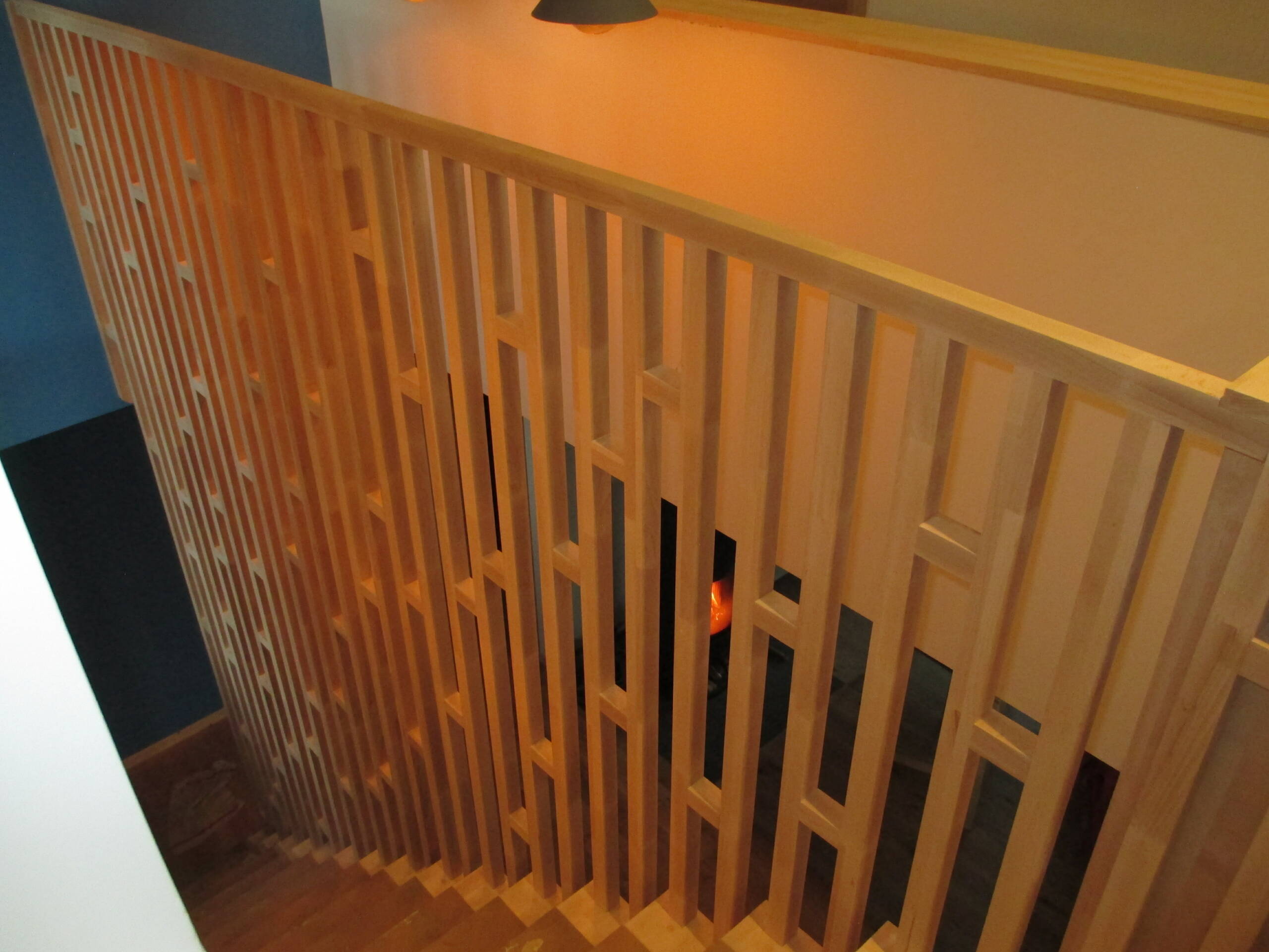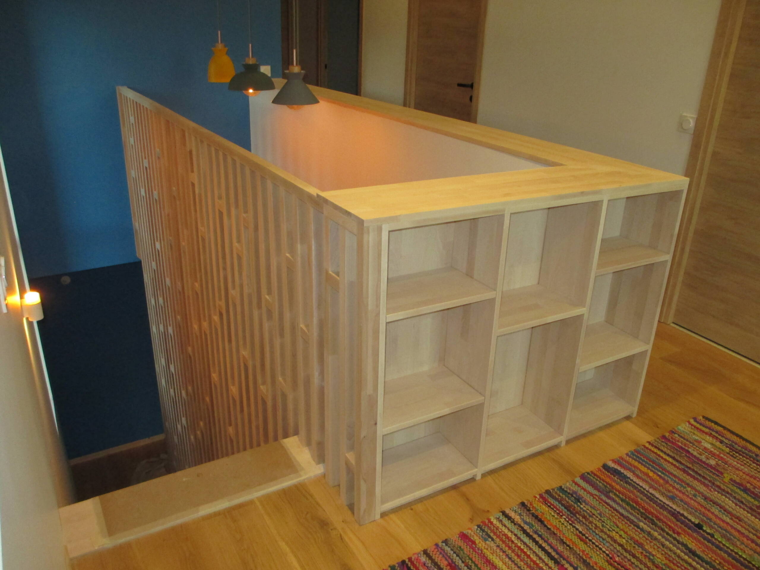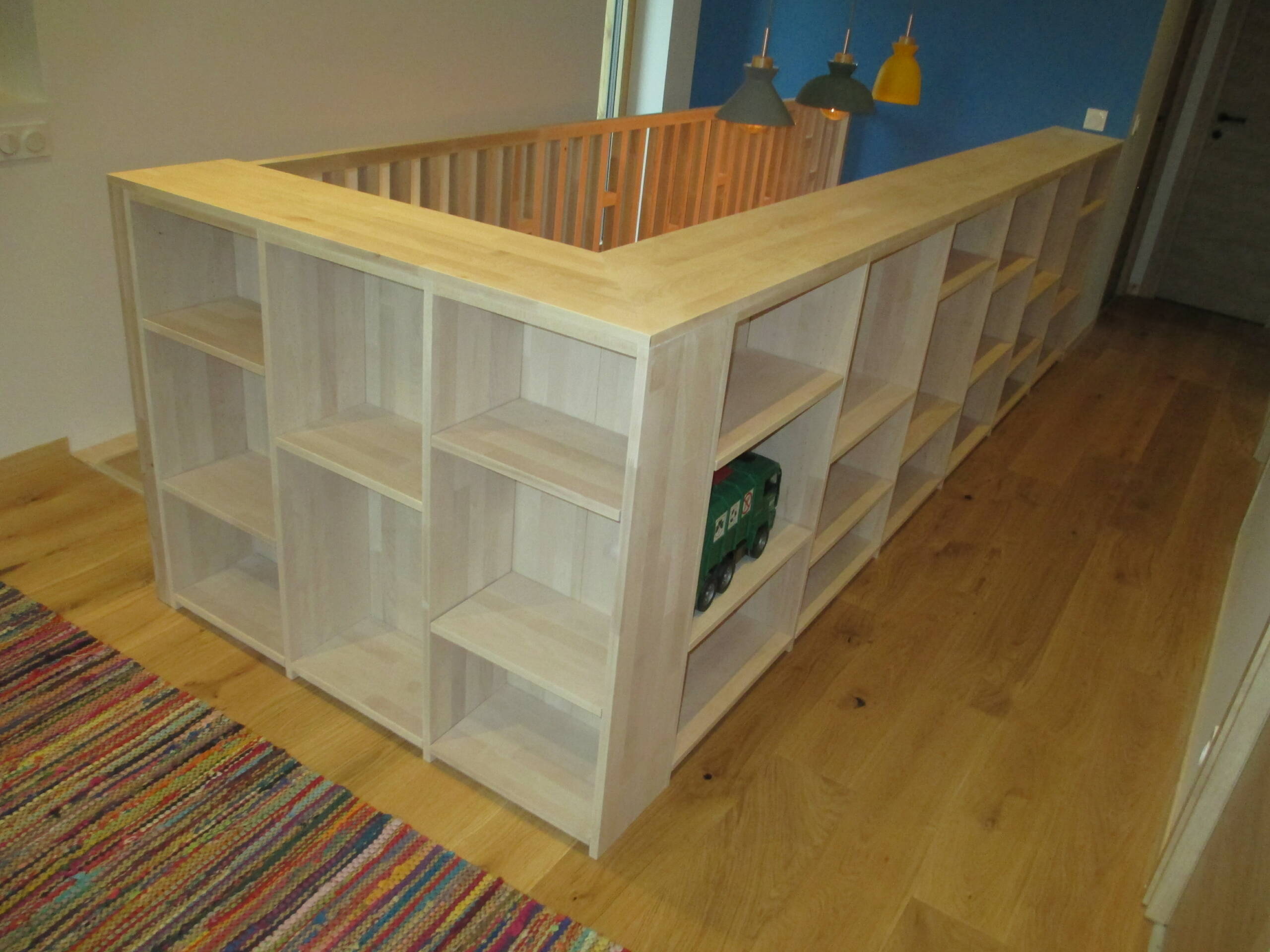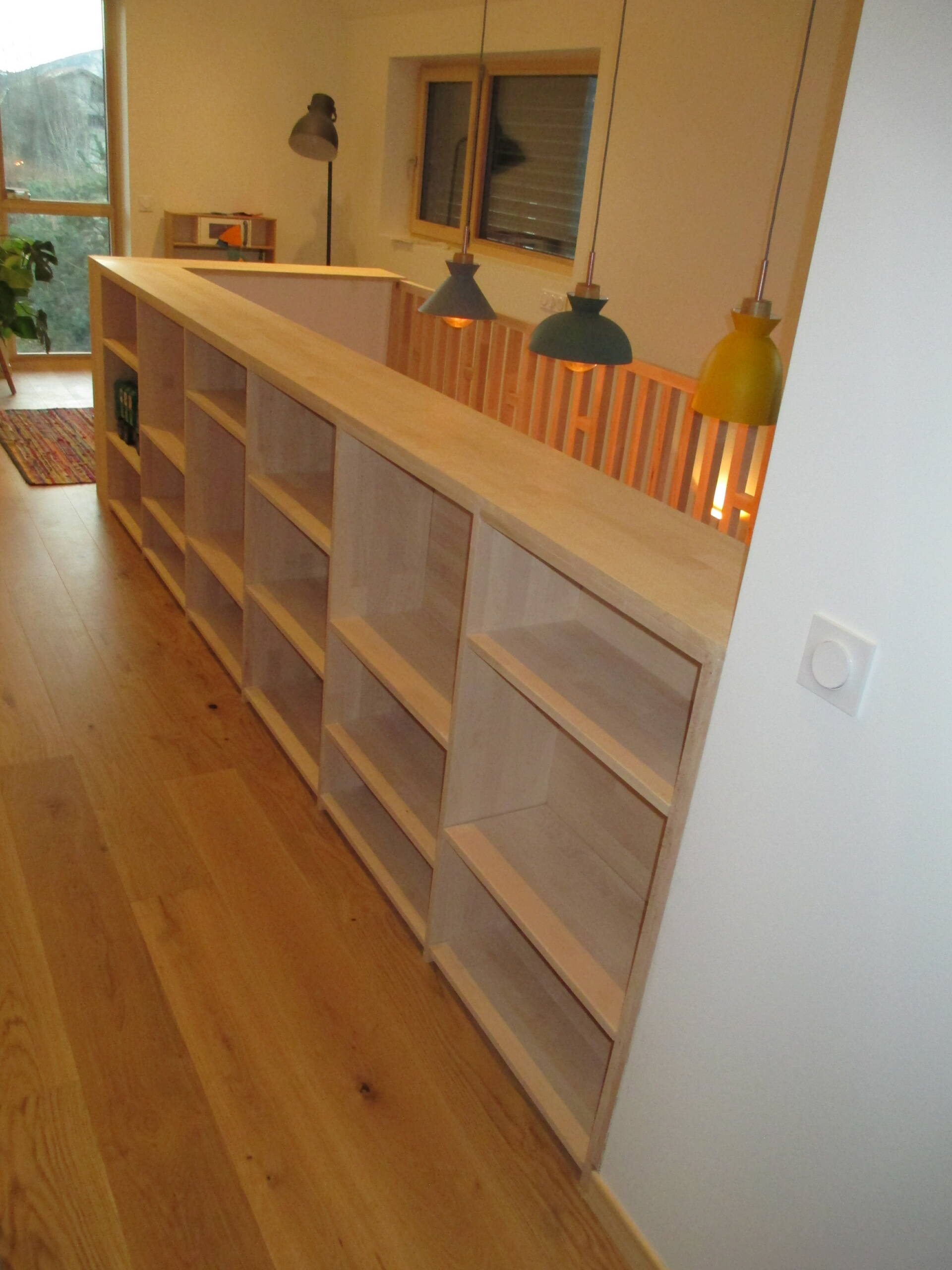 Usinage d’un escalier sur mesure avec garde-corps ajouré et bibliothèque en hêtre blanc…