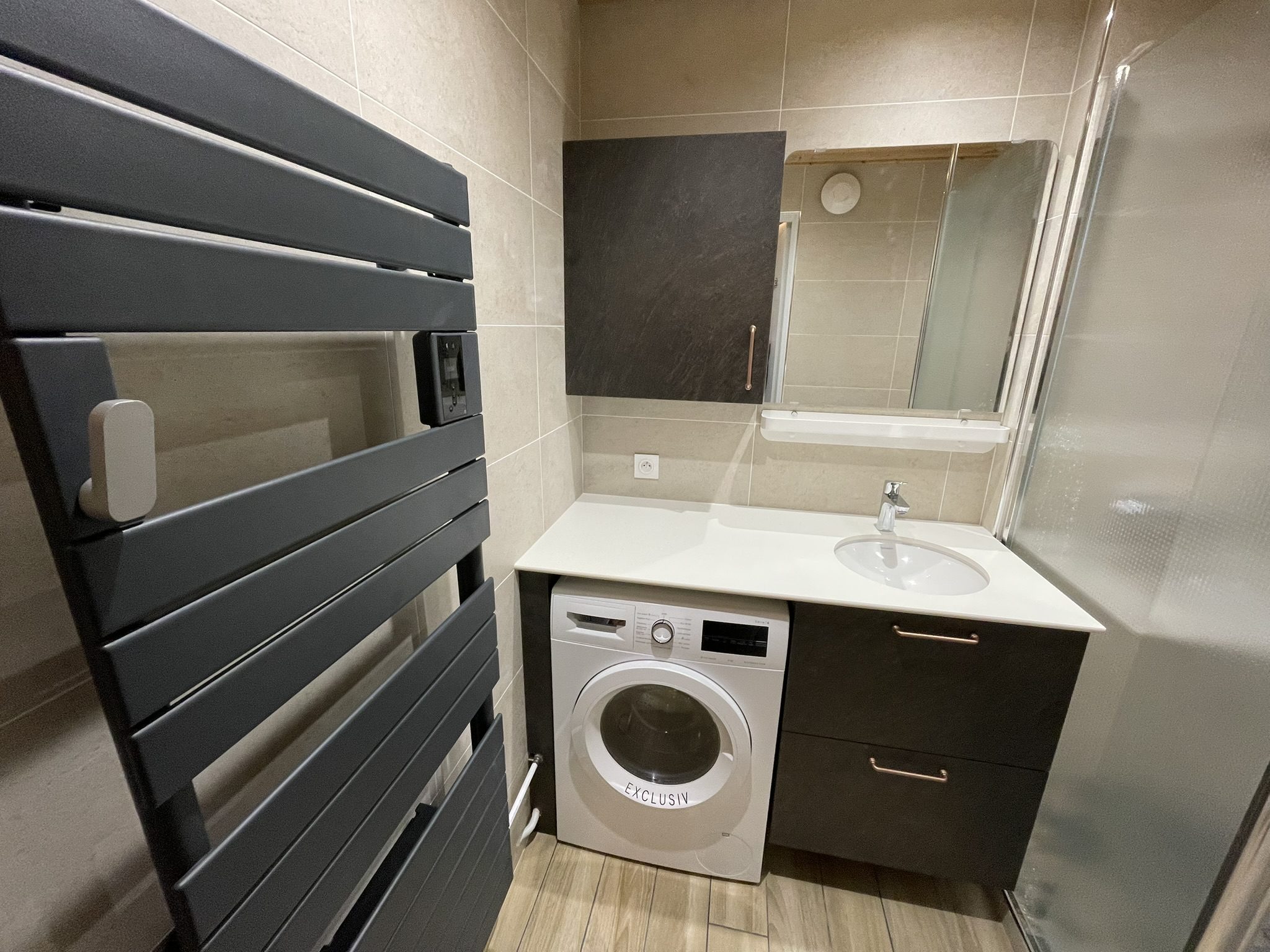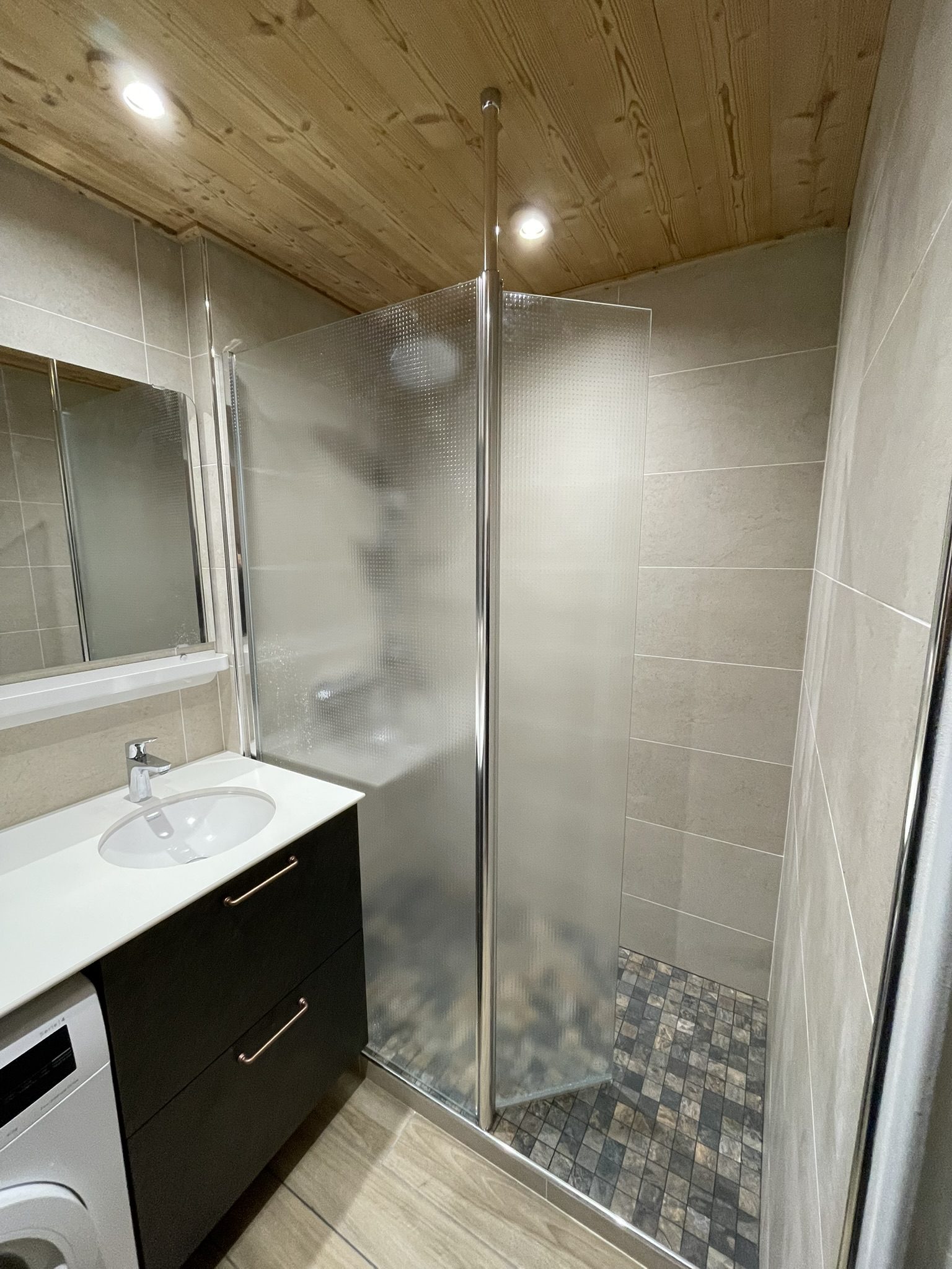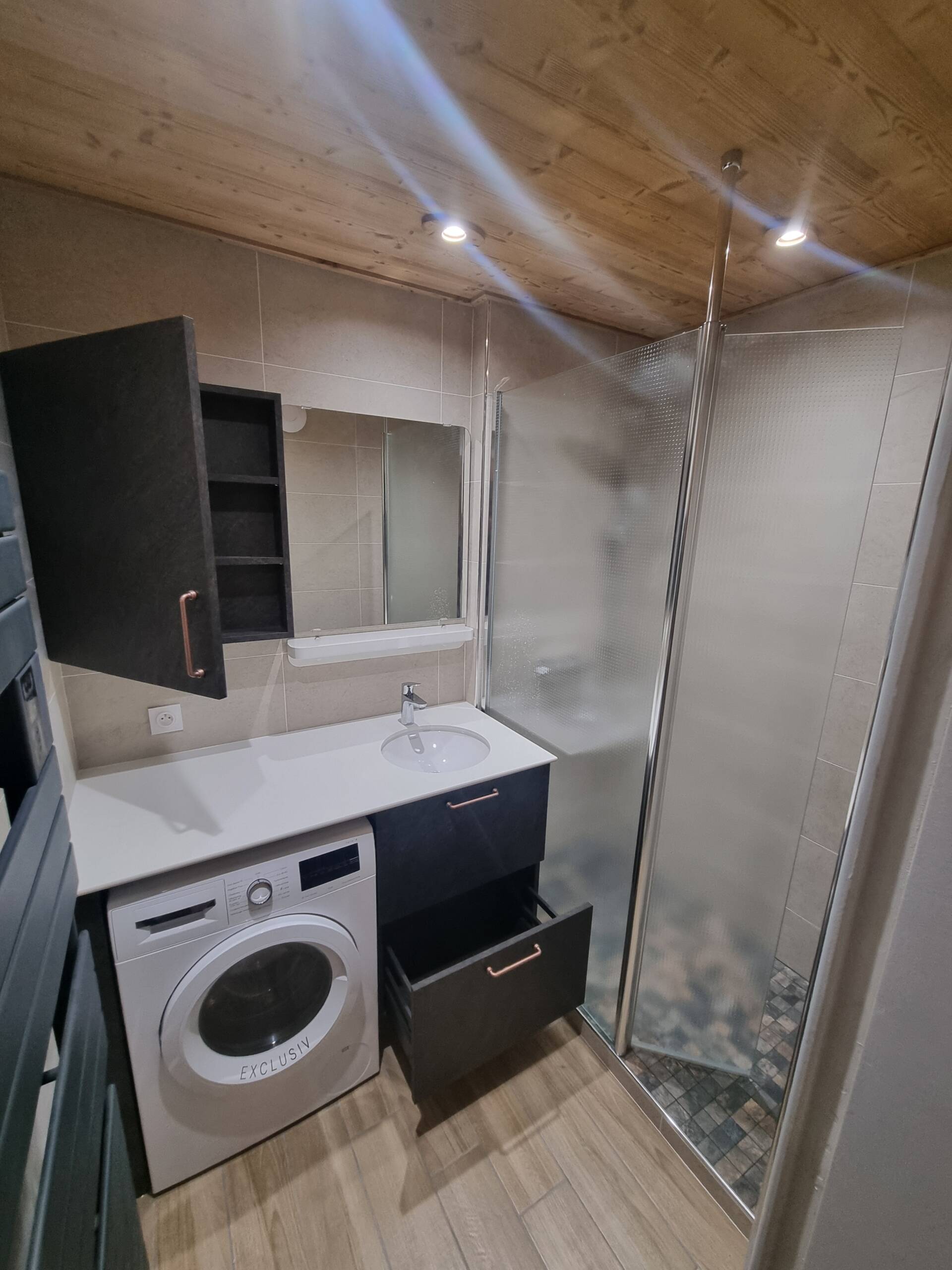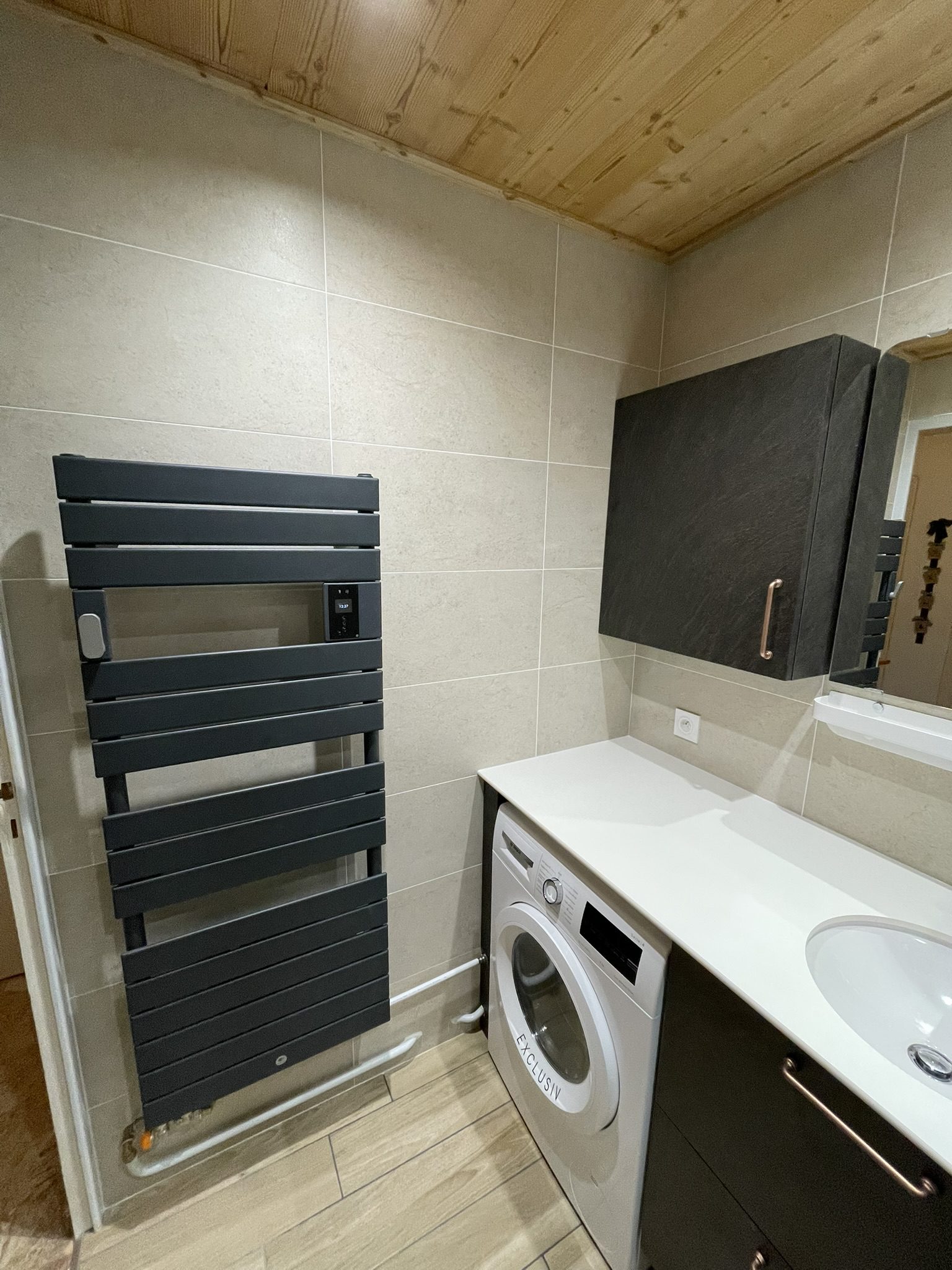 Kansas22/01/2026Salle de bain avec plan de travail en compact et vasque poser par-dessous, machine à laver et radiateur sèche-serviettes… LieuVillard de LansDateMai 2024ParLM CuisineSharePartager