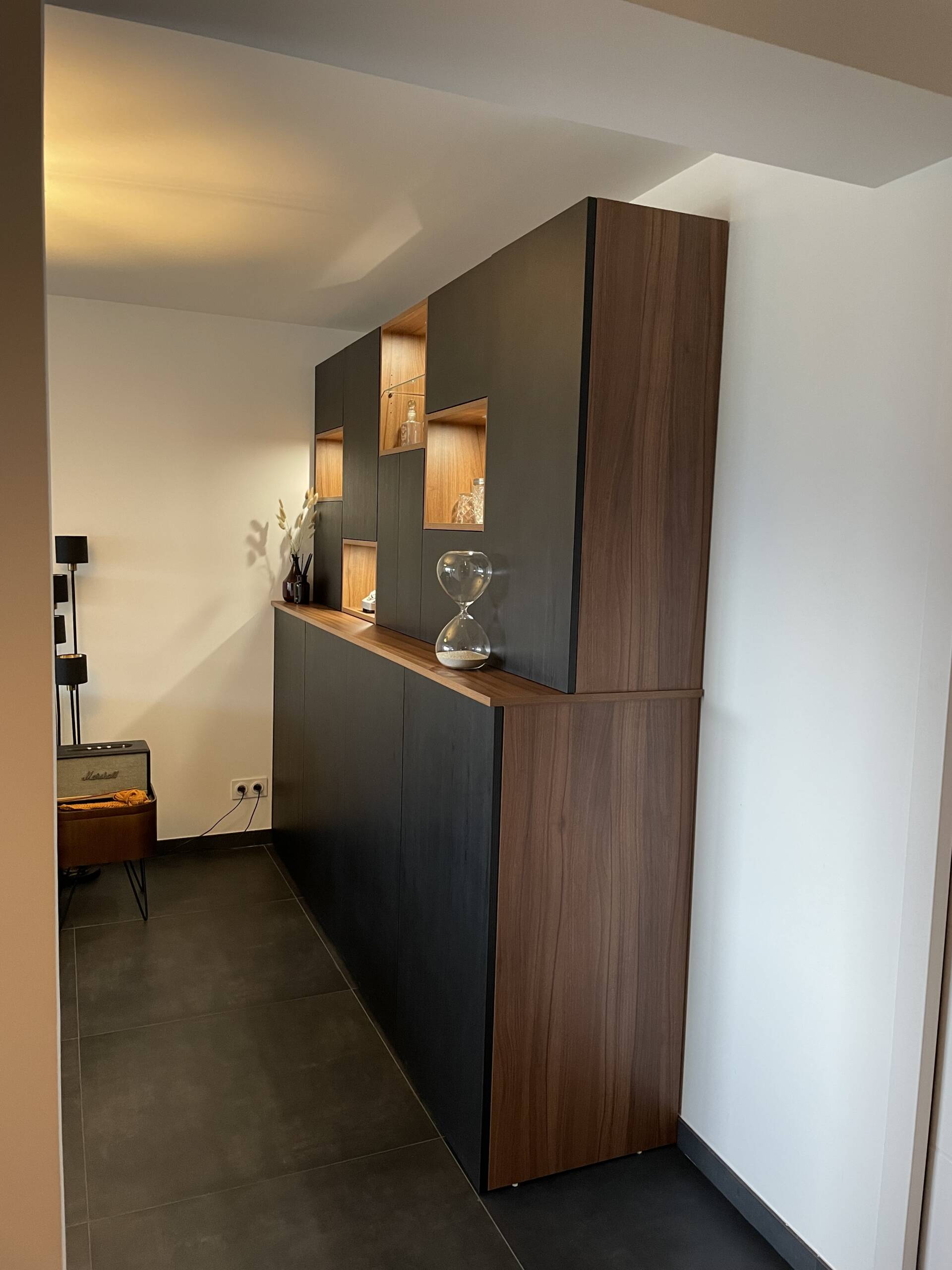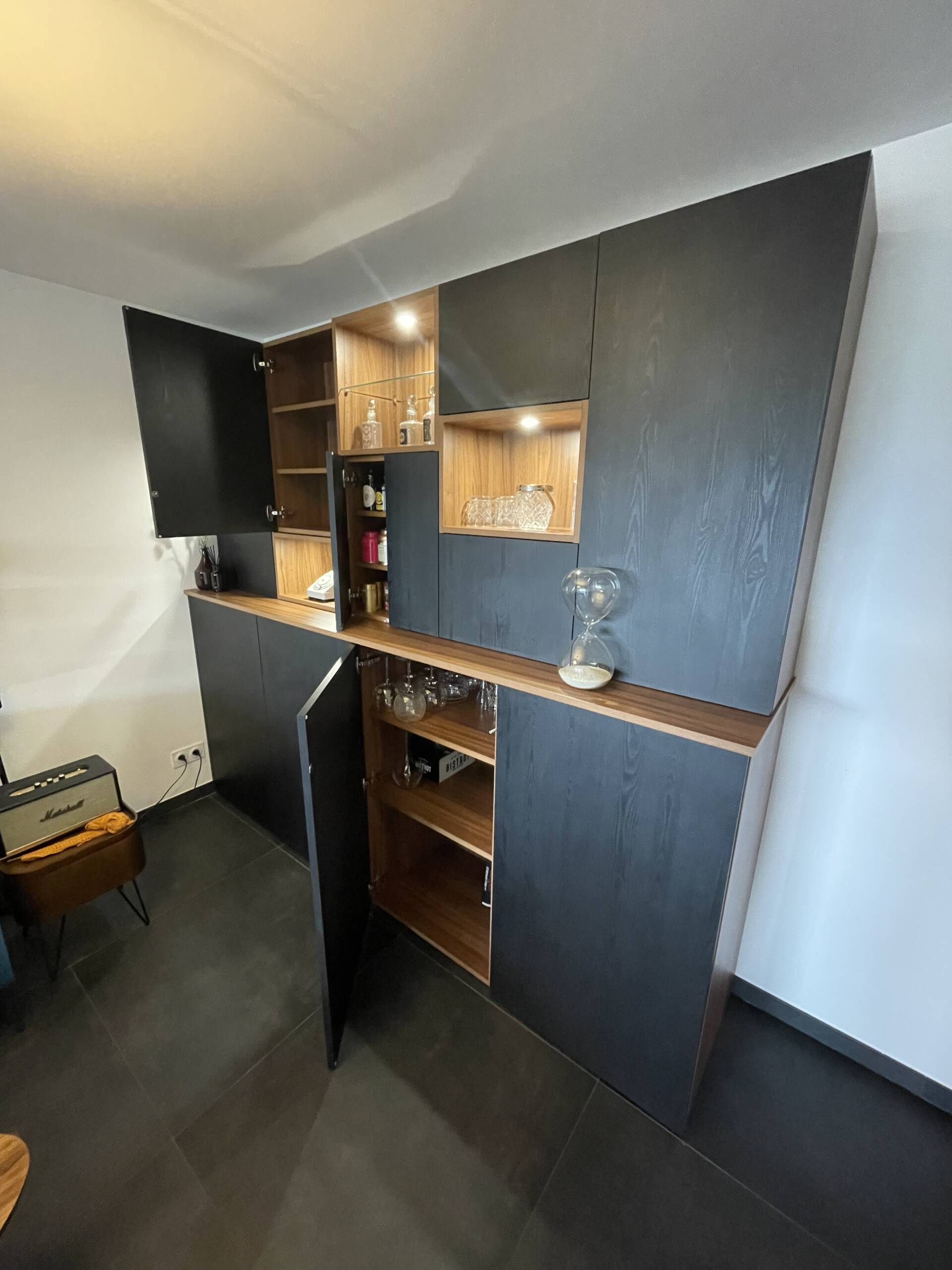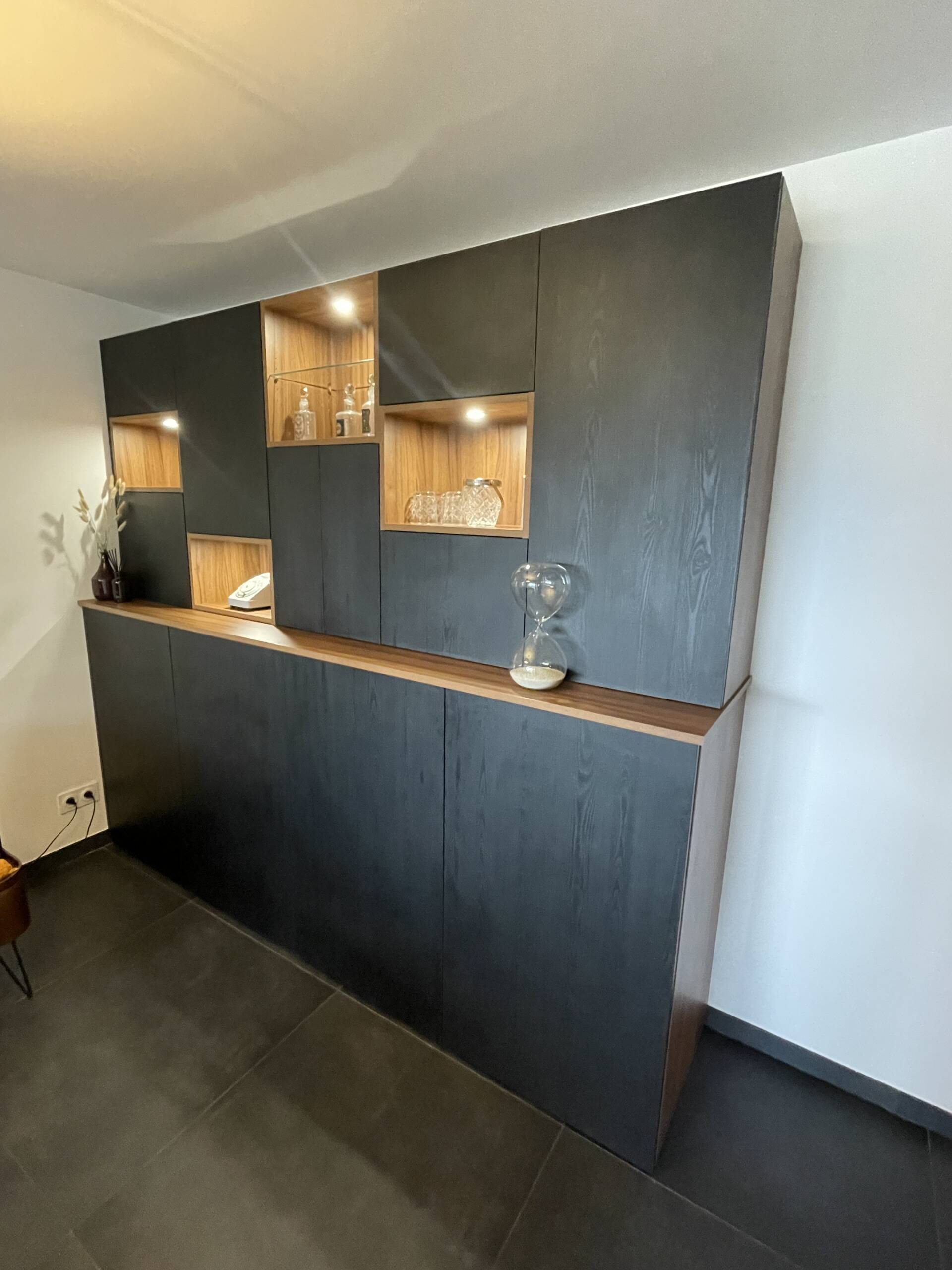 Noyer de Bourgogne27/01/2026Aménagement d’un grand buffet effet noyer et veinage de bois noir avec portes sans poignées, niches et étagères verres éclairer… LieuVillard de LansDateMars 2023ParLM CuisineSharePartager