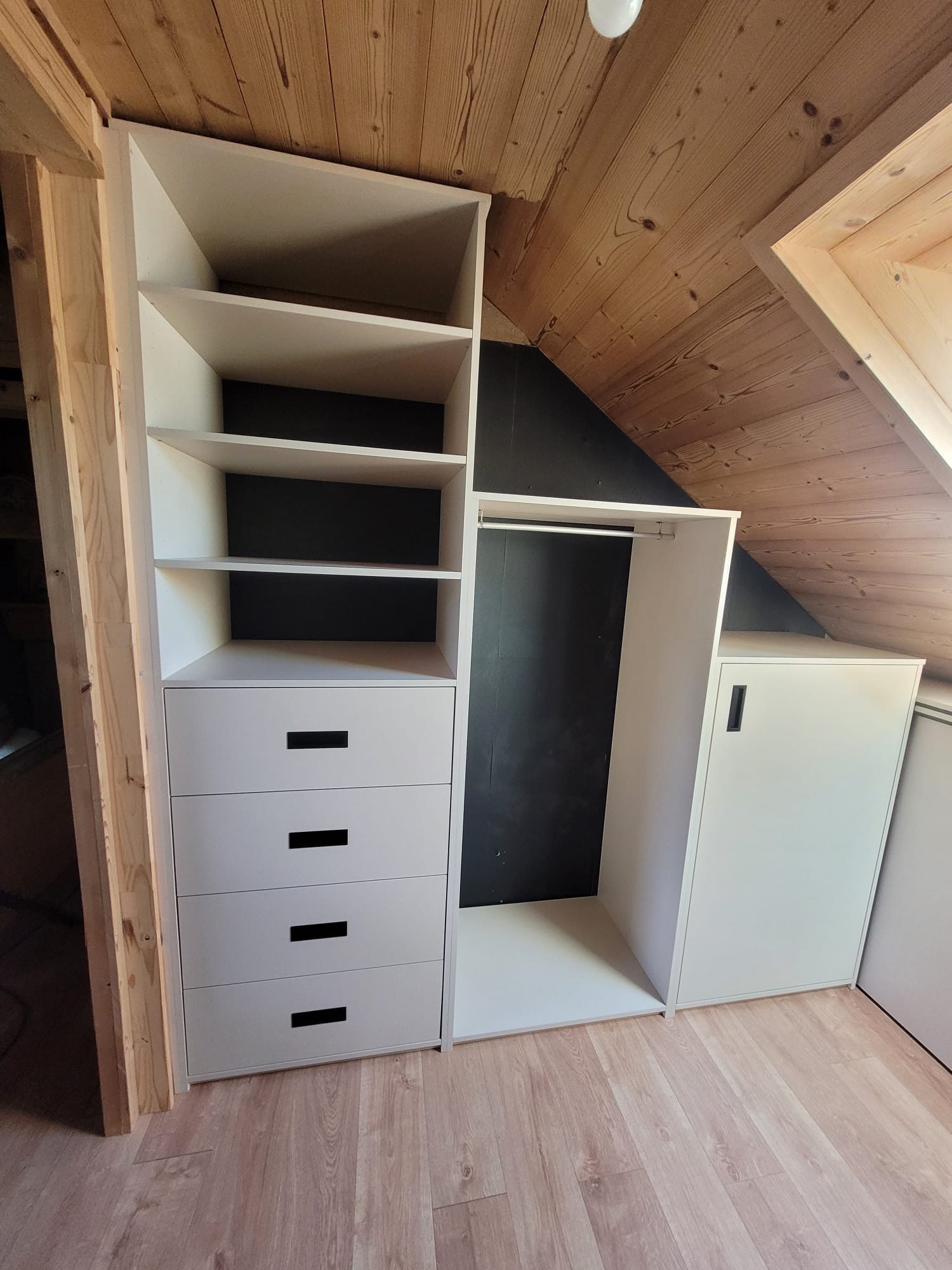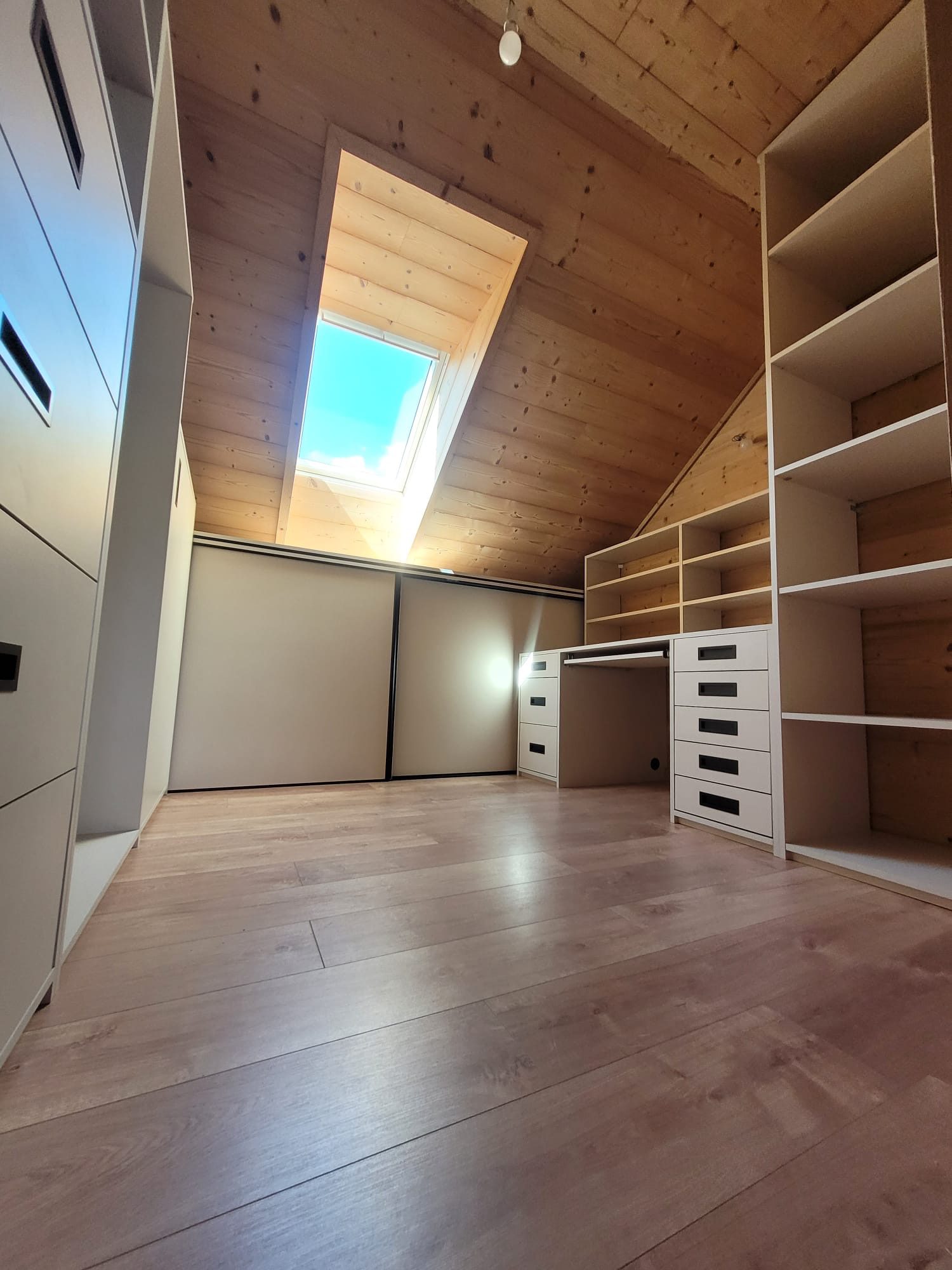 Aménagement en sous-pente d’un dressing et d’un bureau avec penderies, tiroirs, étagères et portes coulissantes avec poignées encastrées noir…