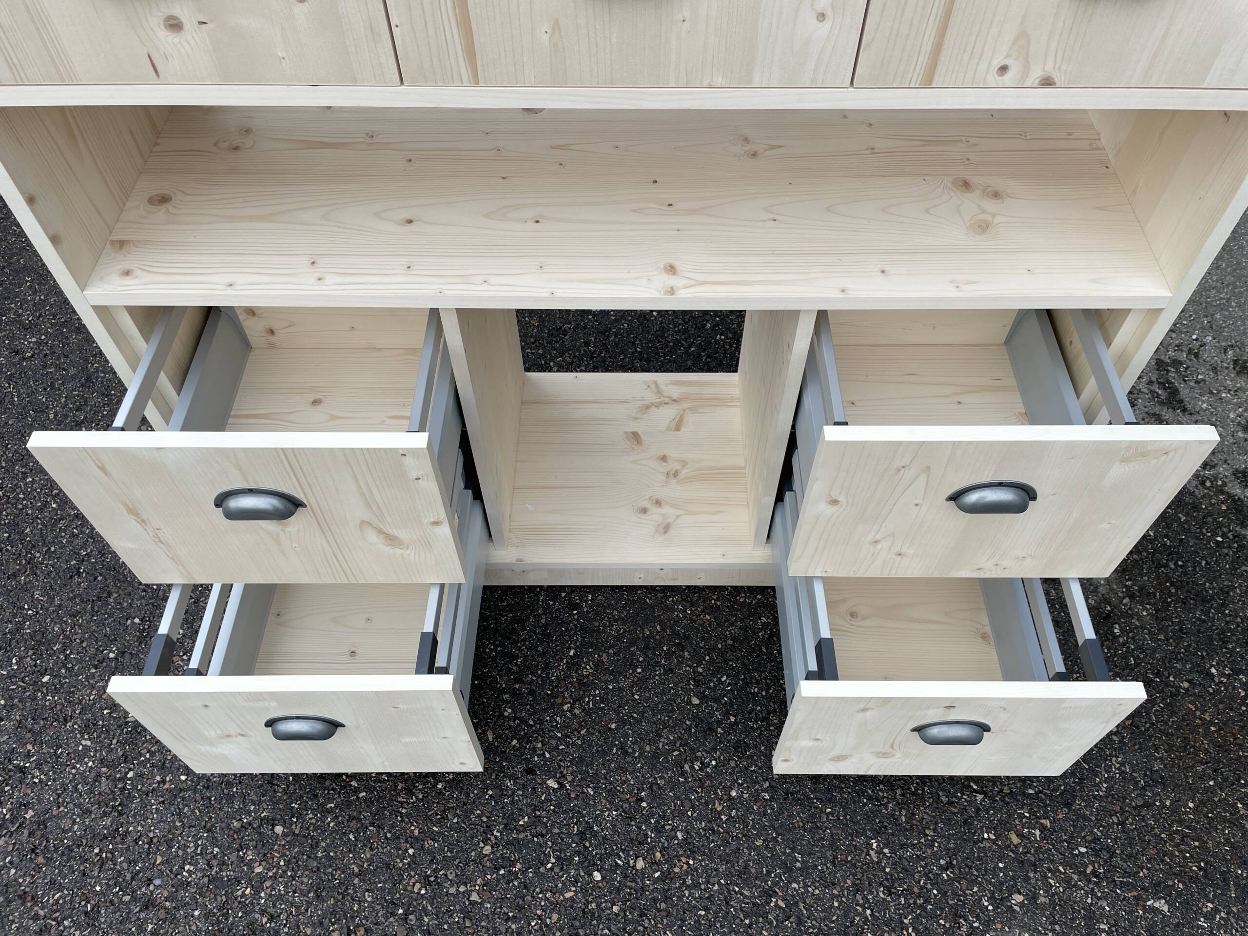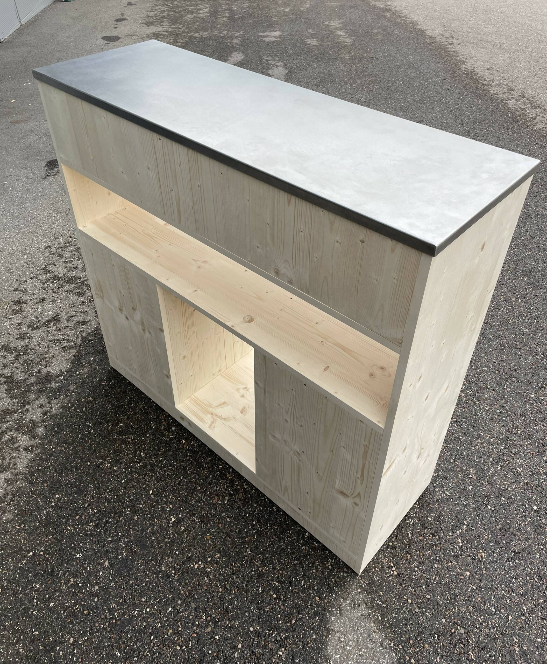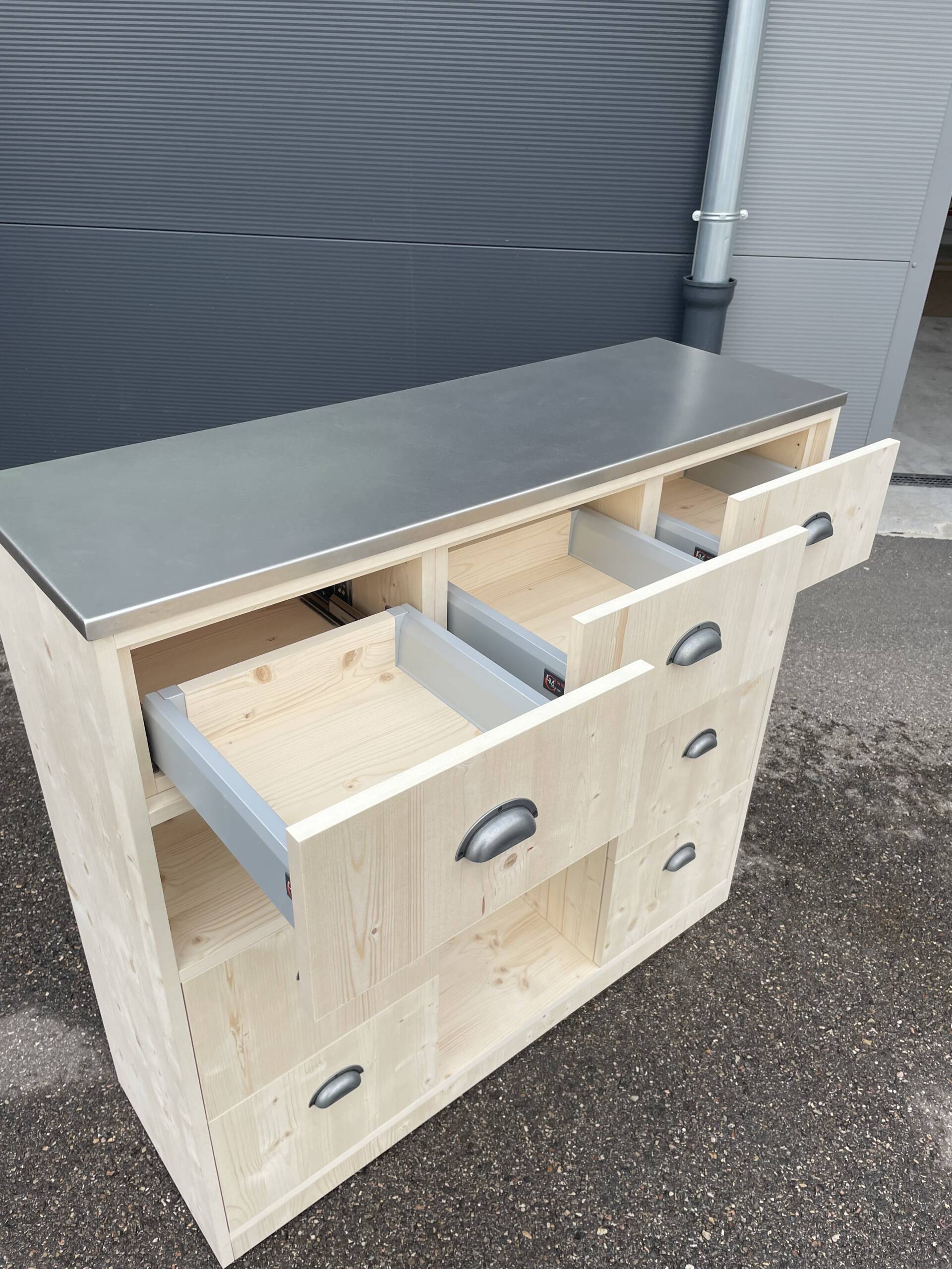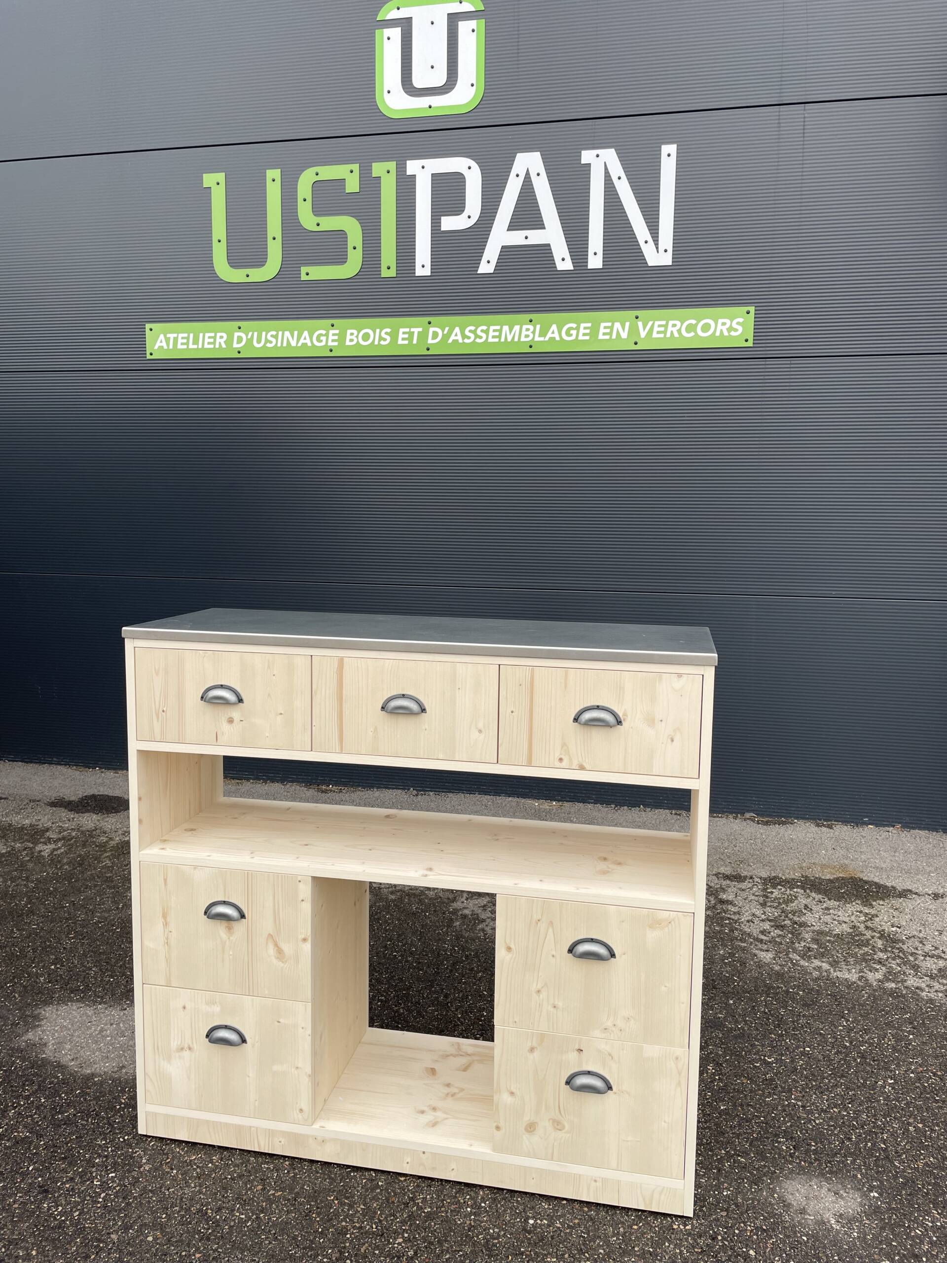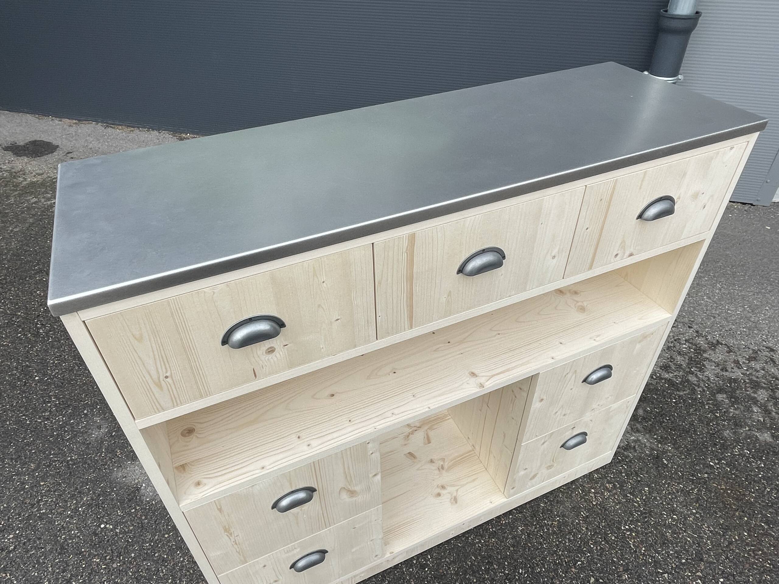 Création d’un meuble tiroirs sur roulettes en trois plis sapin avec plan de travail en inox brouillé et poignée vintage…